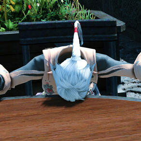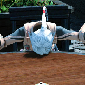 In the corner of Buscarron's Druthers, you spot what appears to be an armored chocobokeep partaking in a small meal. Upon further inspection, curious feathers poke out from where horns or ears might otherwise be, a characteristic unlike any other race on the source.